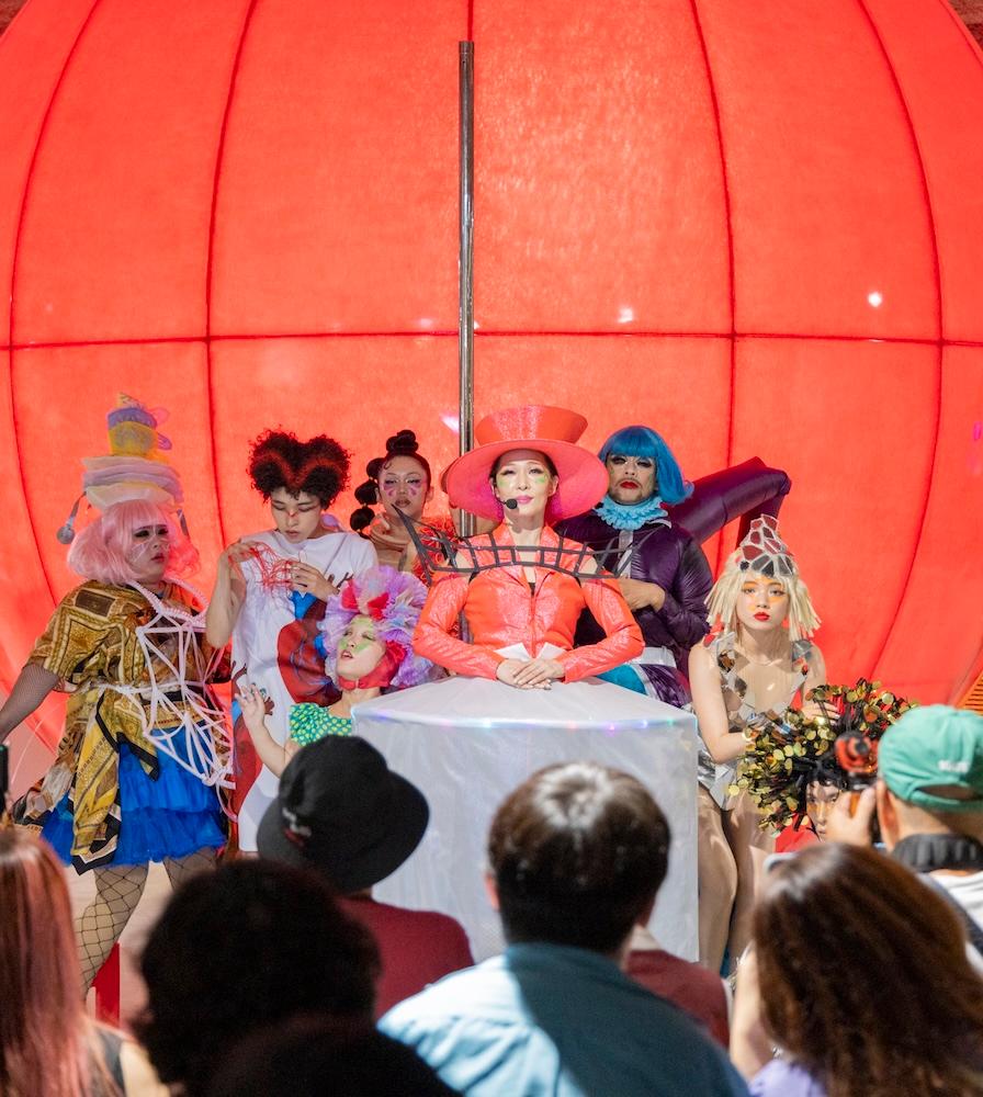 「カド祭り」最大の目玉は、「ハラカド」で繰り広げられた「東京QQQ(トーキョーサンキュウ)」によるパフォーマンスだ。様々な体形とバッググラウンドを持つメンバーの中には、映画『PERFECT DAYS』(2023年)などで俳優として活躍するアオイヤマダさんらも所属。神出鬼没な9名のパフォーマーがゲリラ的に各階のフロアを練り歩くと、極彩色の衣装とダンスに魅せられた来場者から驚きの声が上がる。なお、衣装はコスチューム・アーティスト=ひびのこづえさんが「カド祭り」のために制作したオリジナルだという。