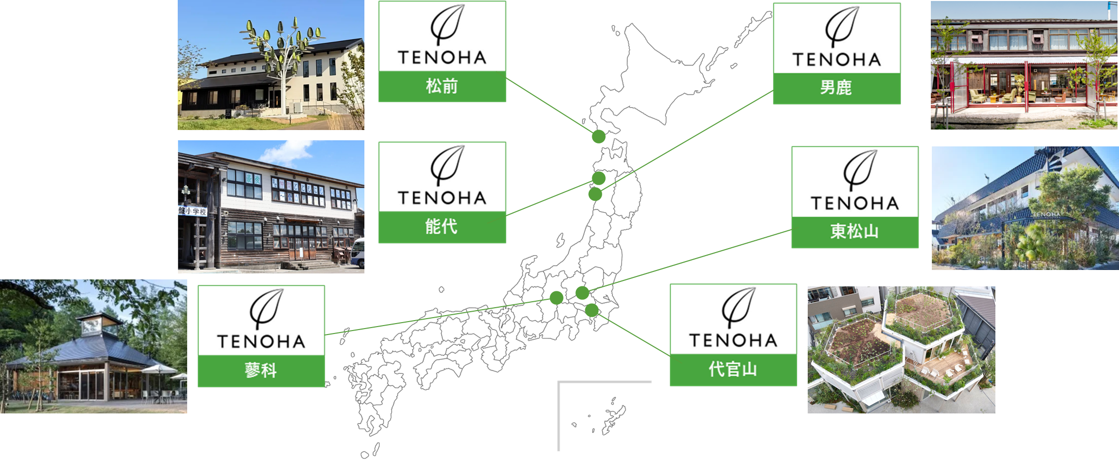 TENOHA(テノハ)は、「手のひら」と「葉」の造語です。施設を大きな木、新しいライフスタイルを沢山の葉として、ものを作り出す手と手が、重なり合う葉のように広がり、新しい時代やものに向けて人やモノ・サービスが育っていく場所であることを体現。地域の人々と手と手をたずさえて、沢山の葉を増やし、更に大きな木へと成長する場を目指している。