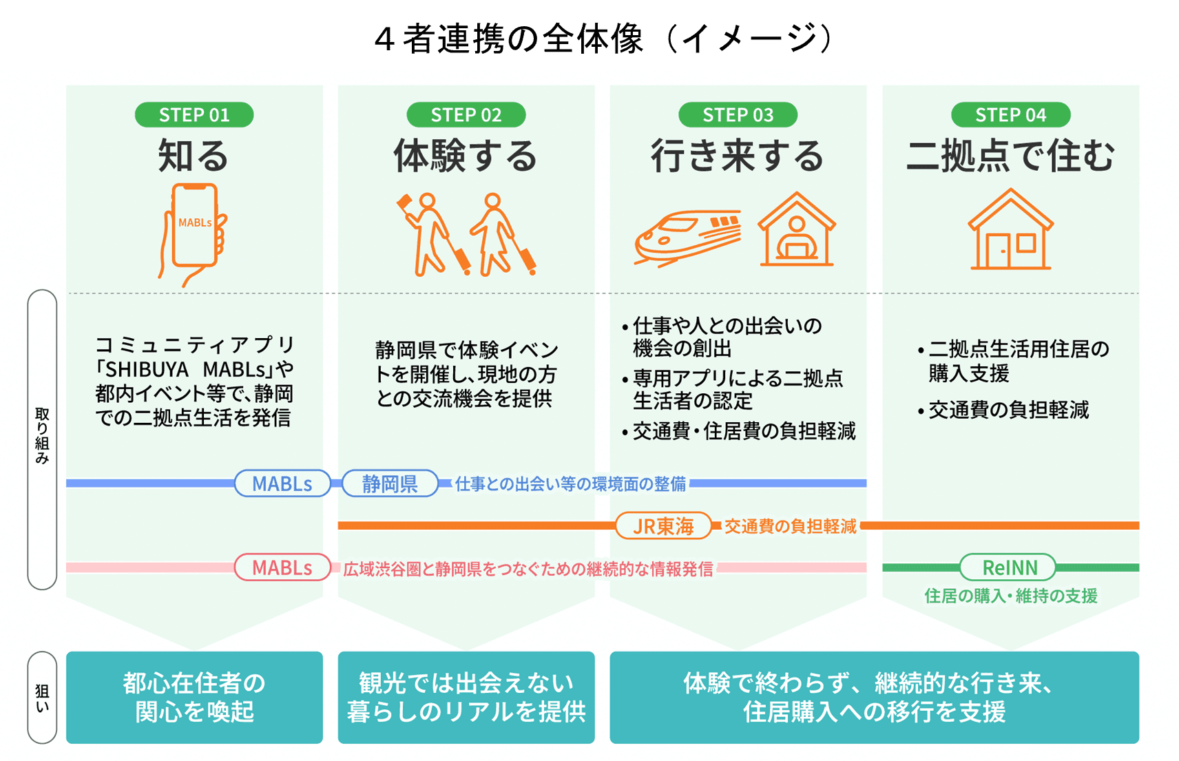 2026年度からは、アプリを起点としたサービスである「MABLs(マブルス)」が、二拠点生活に関する広域渋谷圏での情報発信と、静岡県内での仕事や人との出会いを組み合わせたモデルを新たに構築し、アプリ上で利用可能とすることで二拠点生活を更に推進していくことが狙いだ。また、JR東海は交通費の負担軽減、静岡県は二拠点生活者の認定と現地宿泊事業者と連携した住居費の負担軽減という形で支援。加えてReINNも参画し、二拠点目の住居購入等を支援する。