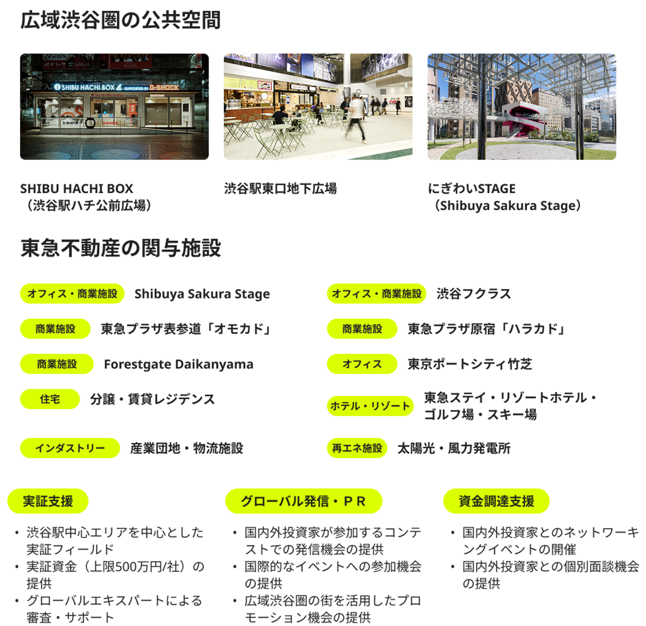本採択に伴い、グローバルで活躍するグリーンテック分野におけるスタートアップの成長を支援するプログラム「GREEN VALLEY SHIBUYA(グリーン バレー シブヤ)」への参加スタートアップの募集を開始。本プログラムでは、広域渋谷圏を中心とした当社施設のほか、渋谷駅前の広場をはじめとする公共空間での実証実験もサポートする。また、環境貢献度で評価を行うコンテストも実施する。